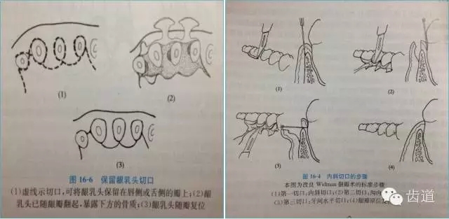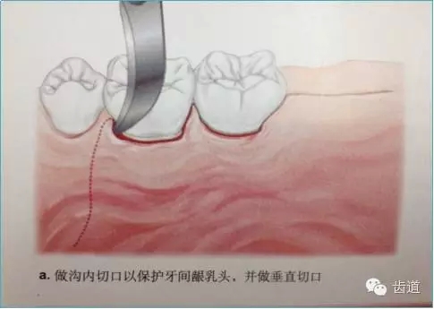 需根據(jù)手術(shù)目的、預(yù)后、美觀效果等綜合平衡決定,可根據(jù)患者和病損區(qū)實際情況靈活選擇溝內(nèi)切口、內(nèi)斜切口、保留齦乳頭切口等,但要注意以盡量保留較多的角化牙齦組織為原則,也即要盡量多保留牙齦乳頭,以保證術(shù)后牙齦能覆蓋膜材料,避免外露導(dǎo)致感染、炎癥等。尤其在鄰面牙間隙處應(yīng)盡量選用齦乳頭保存術(shù)。一般應(yīng)做縱切口和在根方做松弛切口,以保證齦瓣能充分移動和避免過大的張力。