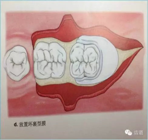 原則是生物膜能充分覆蓋病損區(qū)。冠方緊鄰釉牙骨質(zhì)界,根方伸展至骨邊緣下 2~3mm,保證在組織愈合過程中能確切阻止口腔上皮和牙齦結(jié)締組織與牙根面接觸。