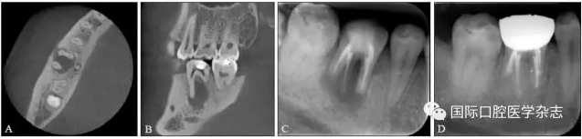 A、B:術(shù)前CBCT圖像;C:術(shù)前X線充填片;D:術(shù)后1年復(fù)查X線片,病變愈合。