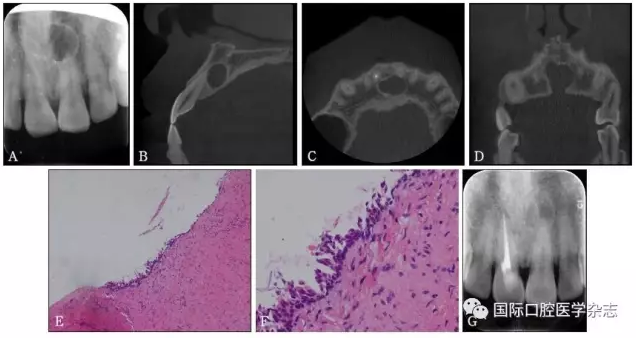 A:術(shù)前X線片;B~D:術(shù)前CBCT圖像;E、F:蘇木精-伊紅染色切片,證實(shí)為鼻腭管囊腫;G:術(shù)后1年復(fù)查X線片,病變區(qū)骨質(zhì)密度恢復(fù)。