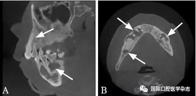 典型病例6 患者的CBCT圖像顯示上下頜骨多發(fā)性的低密度透射區(qū),但牙根完整,未見明顯吸收,牙齒仍有活力(圖6)。
