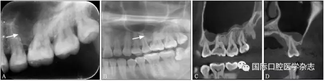 A:X線片;B:全景片;C~D:CBCT矢狀位和冠狀位圖像。