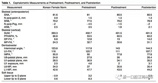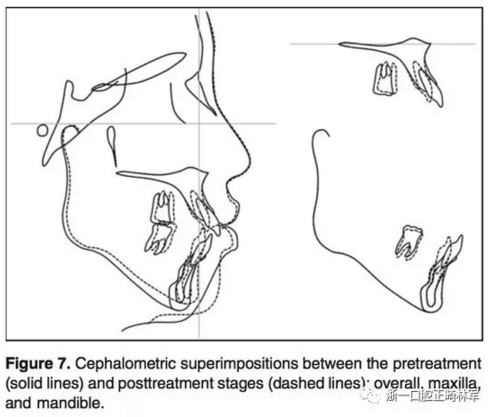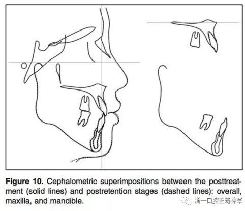 1年的保持,示咬合和面型保持良好。治療后和保持后的重疊像示上下切牙輕微唇傾,導(dǎo)致覆蓋有所增加。上下第一磨牙的位置變化微乎其微。