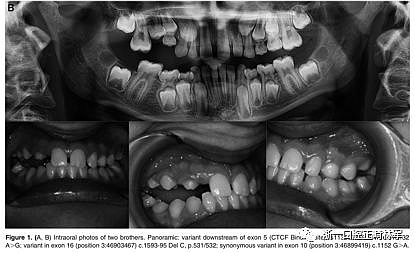 圖1.(A,B)兩兄弟的口內(nèi)照片。全景:外顯子5的下游變體(CTCF結(jié)合位點)rs113566258 SNPc.313±32A>G; 在外顯子16中的變體(位置3:46903467)c.1593-95 Del C,p.531 / 532; 外顯子10中的同義變體(位置3:46899419)c.1152 G>A.