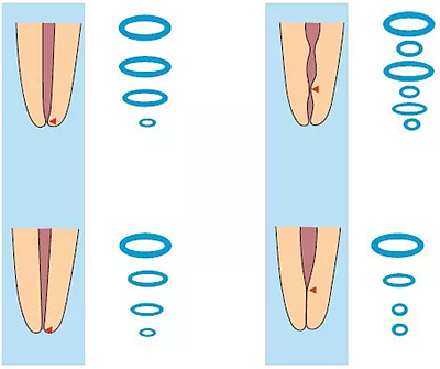 打個比方,根管橫斷面形態(tài)就如同人的眼睛,分“黑眼球”、“白眼球”以及“眼角”區(qū)(圖1)。很多醫(yī)師在進(jìn)行根管治療時,只預(yù)備了“黑眼球”的位置,而“白眼球”、“眼角”區(qū)未行預(yù)備,致使根管治療不徹底而后續(xù)出現(xiàn)問題。實際上,根管形態(tài)大多非圓形,而是扁圓形,且在不同水平的斷面,形態(tài)亦可能不同,這對器械造成一定的挑戰(zhàn)。因此,在根管治療時,醫(yī)師應(yīng)該在腦海中出現(xiàn)根管橫斷面的“眼睛”形狀,在主要通道預(yù)備好后,不要忘記使用鎳鈦銼或超聲器械將根管的邊角清掃干凈,有時還要輔助使用EDTA等行化學(xué)預(yù)備。在此強調(diào)一點,關(guān)于根尖孔的位置,實際上其一般不在解剖學(xué)上的牙根頂端,而在一旁,如果根充后行影像學(xué)檢查發(fā)現(xiàn)根充材料與根尖平齊,則大多為超填。