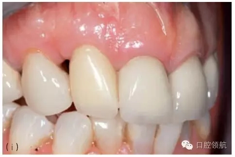 圖8.25 (a)右上頜側(cè)切牙(7號位點)種植體唇側(cè)黏膜退縮。種植體有唇側(cè)植入位置不佳。(b)拆下冠和基臺并以暫時的局部義齒修復(fù)后的臨床情況。局部義齒選取正確的冠長度,顯示出軟組織垂直向缺損。(c) 牙合面觀:拆下冠和基臺,安裝愈合基臺。清楚可見種植體唇側(cè)植入位置不佳。(d)做頰側(cè)全厚瓣翻瓣,可見牙槽嵴骨水平與種植體相對關(guān)系算是常規(guī)位置。(e)從腭側(cè)獲取結(jié)締組織瓣,覆蓋種植體唇側(cè)與牙合面。(f)唇面觀:瓣關(guān)閉縫合后,暫時局部義齒修復(fù)。(g)術(shù)后2個月,結(jié)締組織移植瓣已完全與周圍組織融合,種植體完全覆蓋。(h)牙槽嵴頂做小切口暴露種植體頂端,安裝一個選磨過的愈合基臺。(i)種植體粘結(jié)暫時冠。原來退縮的程度有所減小,但是完全恢復(fù)軟組織的高度沒有實現(xiàn)。種植體唇側(cè)植入位置不佳時,恢復(fù)的軟組織垂直高度有限。