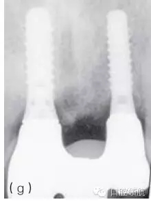 圖8.26 (a)一個非常嚴(yán)重的病例:上頜前牙區(qū)植入3顆種植體。首先,考慮到美學(xué)效果,應(yīng)該只在8號和11號位點植入2顆種植體;其次,8號種植體冠向植入位置不佳伴肩臺外露。3顆種植體都需要取出。(b)種植體取出術(shù)中應(yīng)做避開齦乳頭的小切口,盡量減少創(chuàng)傷。(c)翻開黏骨膜瓣后清楚可見唇側(cè)骨缺損。在種植體鄰面小心去骨,盡量減少唇側(cè)去骨。(d)取出3顆種植體后的臨床情況。骨缺損處清創(chuàng),膠原塞填充。(e)手術(shù)完成,初期傷口關(guān)閉需達到軟組織完整覆蓋缺牙區(qū)。6~8周后種植體植入并同期行GBR。(f)植入2顆種植體和局部GBR骨增量治療3年后的效果。用低替代物含量的骨充填物(去蛋白小牛骨礦化基質(zhì))行橋體區(qū)域垂直骨增量。(g)3年隨訪檢查的X線片。新植入的2顆種植體顯示出穩(wěn)定的種植體周骨水平,尤其在橋體區(qū)域。