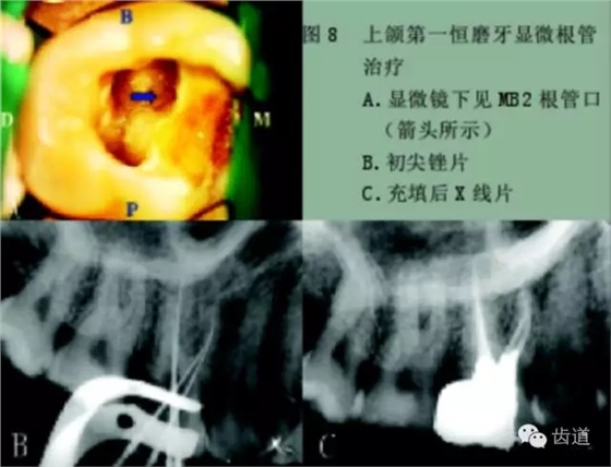 對(duì)于有些牙根管在根管口下3~5毫米處分叉以及近頰和遠(yuǎn)頰根管口非常接近的上頜第二磨牙,手術(shù)顯微鏡更是相當(dāng)有價(jià)值的工具。因?yàn)楦艿姆植纥c(diǎn)和獨(dú)立的根管口能清楚地在顯微鏡下被觀察到。