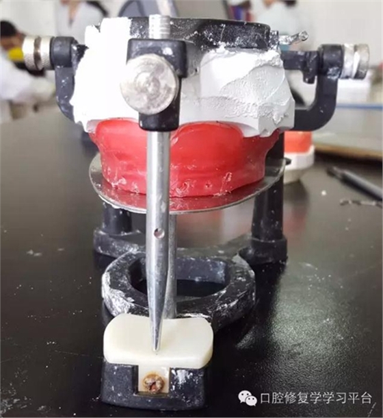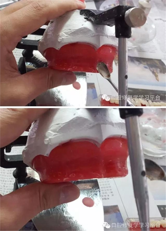 用雕刻刀反向在人工牙牙齦邊緣位置刻出標(biāo)記線。標(biāo)記線以上牙面的蠟要清除干凈。