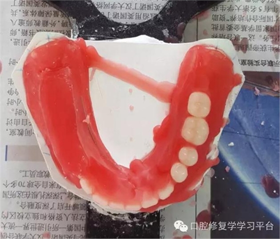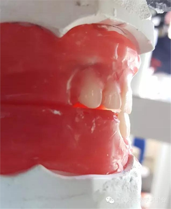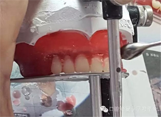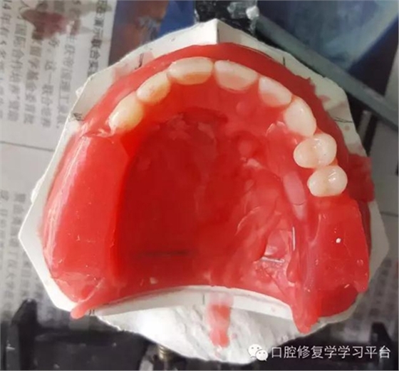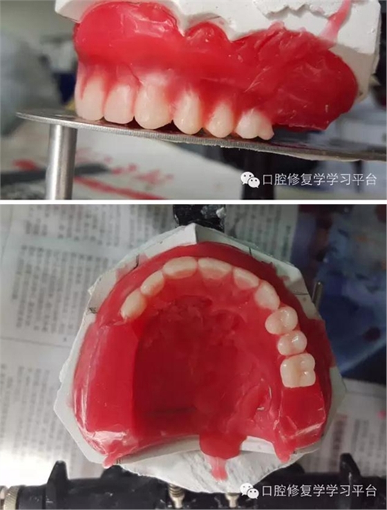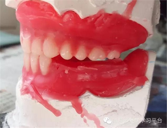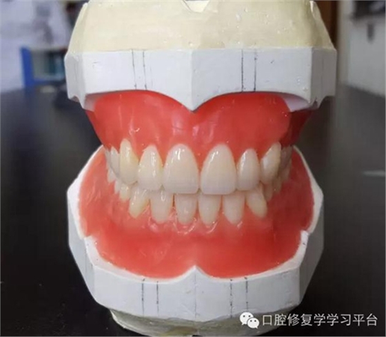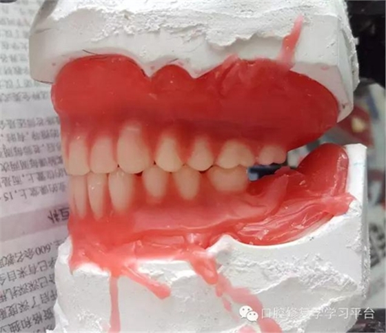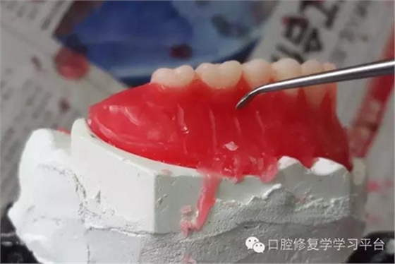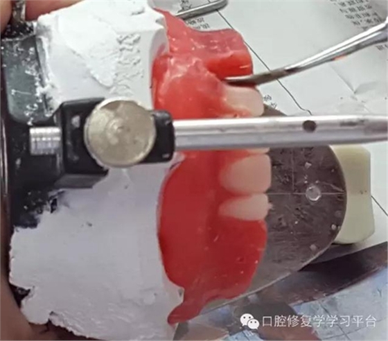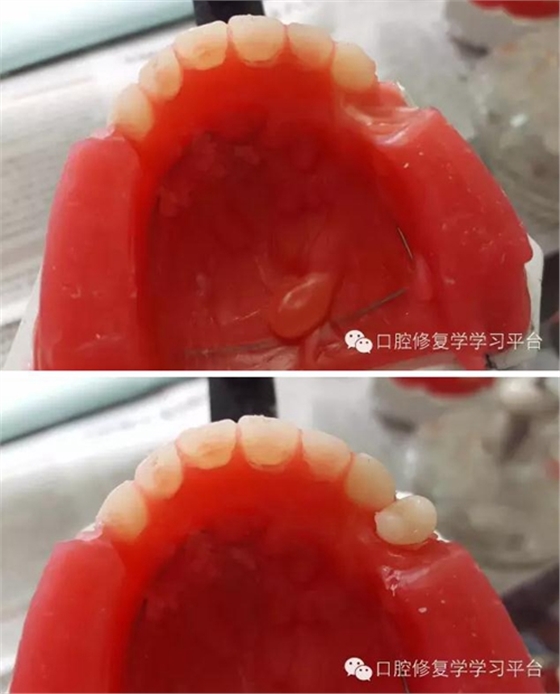如果人工牙過長(zhǎng)或者頸部接觸模型時(shí),只能調(diào)磨人工牙的蓋嵴部,否側(cè)頸部是無法向舌側(cè)排進(jìn)去。