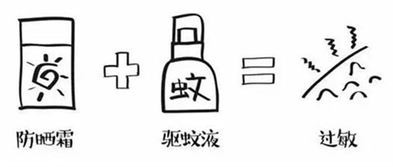 ——驅(qū)蚊液的主要成分為避蚊胺和酒精,而防曬霜中含有二苯甲酮,大量的避蚊胺、酒精和二苯甲酮混合,高溫還促進(jìn)皮膚吸收這些化學(xué)成分,引起過(guò)敏。