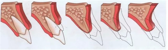 在前牙區(qū)進(jìn)行即刻種植,涉及到的最大問題為美學(xué)問題,這是挑戰(zhàn)之一;如何在即刻種植后保持前牙區(qū)牙槽嵴的外形是挑戰(zhàn)之二,只有維持了牙槽嵴外形才能夠維持種植牙的美學(xué)效果。所以,前牙區(qū)即刻種植的最大挑戰(zhàn)為如何阻斷唇側(cè)骨板的喪失。缺失牙后牙槽嵴的自然轉(zhuǎn)歸改建、吸收如圖1所示,但種植醫(yī)師都希望牙槽嵴能夠依然維持在沒有發(fā)生吸收、改建的狀態(tài),這樣才能達(dá)到理想的美學(xué)效果。