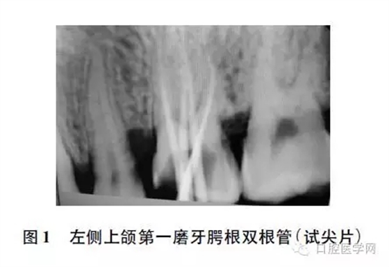 1周后復(fù)診,無不適,行Protaper大錐度牙膠尖+根充糊劑冷測壓法嚴(yán)密充填根管。X線片示適充(圖1)。磷酸鋅水門汀墊底,光固化充填,觀察1周后行冠修復(fù)?;颊咝懈苤委?全冠修復(fù)后,無主觀癥狀,患牙形態(tài)良好,正常咀嚼功能恢復(fù)。