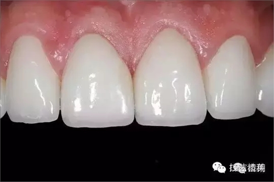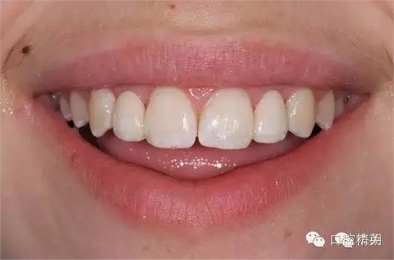 最后用雙固化的樹(shù)脂水門?。―uo-Link)粘固貼面。準(zhǔn)確就位后,先在牙頸部光固化3秒,去除多余的水門汀,然后再光固化40秒。自固化時(shí)間需等待5分鐘。