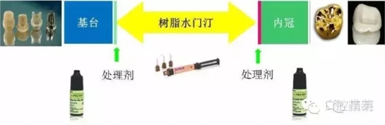 種植體上部結(jié)構(gòu)的粘接,涉及到基臺(tái)(鈦或氧化鋯基臺(tái))與樹(shù)脂的粘接,樹(shù)脂與全冠(氧化鋯或貴金屬冠)的粘接。同樣,我們需要分別對(duì)基臺(tái)、內(nèi)冠進(jìn)行處理,最后用樹(shù)脂水門汀粘固。