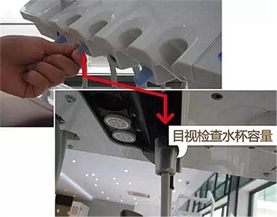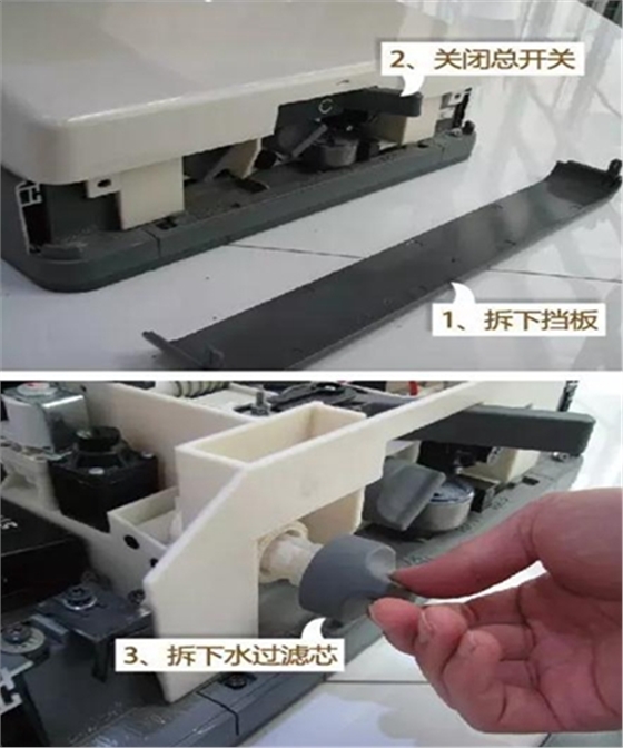 水過濾芯的清潔程序:拆下灰色擋板—關(guān)斷總開關(guān)—拆下水過濾芯(注意安裝方法) —用三用噴槍清潔水過濾芯—裝回水過濾芯—開機(jī)—沖洗痰盂—水杯放水—三用噴槍放水。