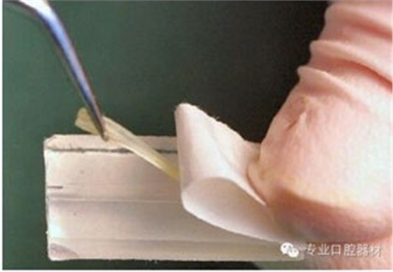 5、打開內(nèi)包裝用鑷子取出纖維束,將纖維一端用手工器械或硅膠(RefixD)壓于流動(dòng)樹脂上。光固化這端已固定好的纖維束5-10秒,但要注意用寬的器械(如StickStepper或雕刻刀)保護(hù),防止其它纖維束被光照固化。