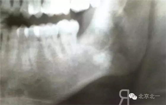 圖一:手術(shù)前(哈爾濱同行提供,接收外院患者,單位不詳)X片可見下頜骨中央高密度影像。