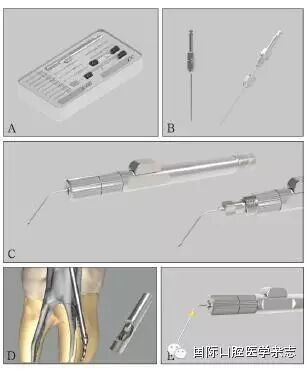 IRS系統(tǒng)體積較小、使用靈活,可在根管中旋轉運動,操作性強。然而,這套裝置也存在一定的局限性。微套管系統(tǒng)內芯運動方式為旋轉前進,運動中心始終在套管橫截面的中心,使用時有將分離器械向根尖方向推進的風險(圖13D)。由于裝置末端把手的阻擋,操作時無法在顯微鏡直視下確保分離器械是否進入套管。由于產(chǎn)品設計的限制,顯微套管較薄,且側方開窗下緣距末端較近,因此若窗緣損壞,器械就無法使用,易損耗。