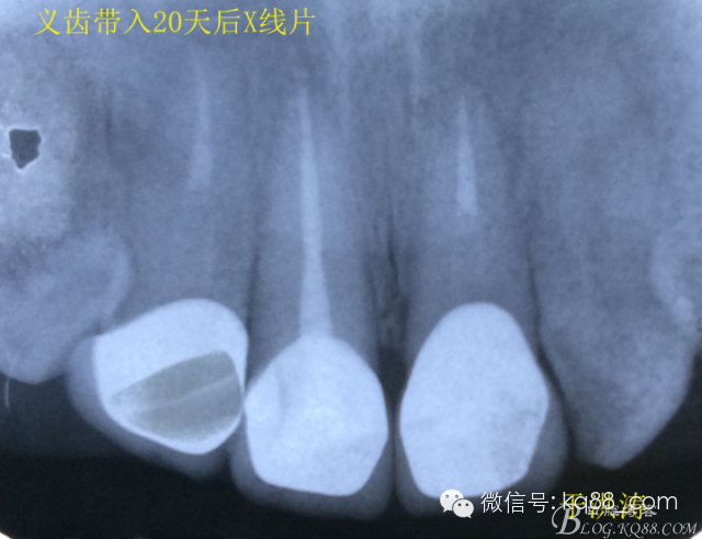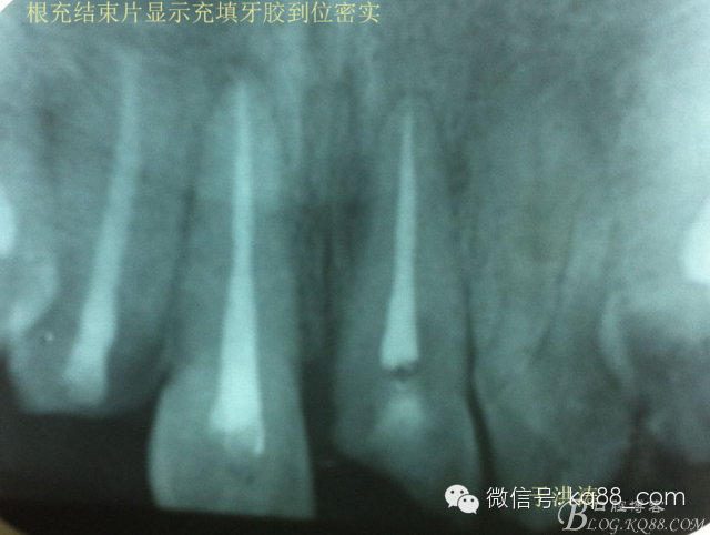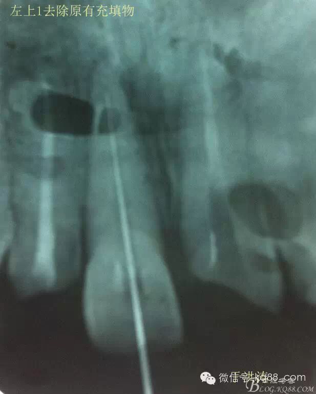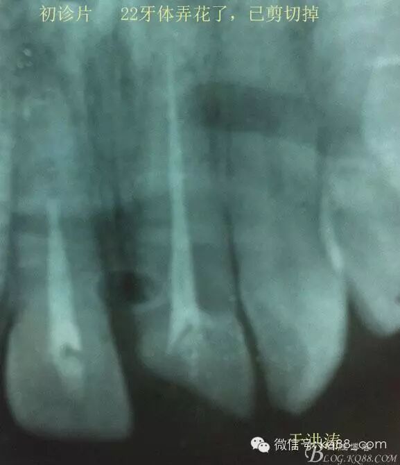 檢查:明顯可見22牙冠橫向斷裂至頸1/3處,近遠中與腭側斷裂至齦下??梢?/span>11牙冠斜向近中斷裂,近中與腭側均斷裂至齦下。21牙冠中1/3有裂痕。11 21 22松動(0),11 21叩(+),22叩(-),11 21 22探(-),11 21 22冷熱(-)。11 21 22唇側牙齦與粘膜和根尖相應部位未見明顯改變。11 22腭側牙齦增生性改變。11 21 22腭側粘膜和根尖相應部位未見改變。11 21 22舌側窩均有充填物。面部左右對稱無改變。余牙正常。(11,21,22牙冠顏色無改變)。 輔助檢查:X線片檢查11 22牙冠均有缺失。11 21 22 髓腔內均有充填物,11充填不到位, 21充填不實,22充填到位髓腔高密度影像。11 21 牙周膜有增寬,21根尖區(qū)有2mm左右低密度影像。未發(fā)現(xiàn)有牙根側穿或斷裂異物。 診斷:11,21慢性尖周炎,11,22殘冠。 治療計劃: 22無需治療。11 21 建議牙齒根管再治療。告知情況及費用。 1,11 21去除根充物。 2,11 21根管治療。 3,11 22纖維樁樹脂核修復。 4,高頻電刀去除11 22腭側牙齦組織到斷面。 5,11,21,22全瓷單冠修復牙齒。 治療過程:經(jīng)患者同意。H銼去除11 21原有充填物,未發(fā)現(xiàn)明顯滲出物,無異味。K銼疏通根管,VDW根測儀測量長度,11牙20mmWL,21牙20mmWL。S3鎳鈦器械預備根管。(全程1%次氯酸鈉沖洗EDTA溶解潤滑)試尖片顯示牙膠未到位,繼續(xù)向牙根尖各2mm進入預備。吸潮紙尖吸干根管,登士柏樹脂根充糊劑輸送至根尖部位,以測量數(shù)據(jù)用牙膠尖冷充側壓充填根管,3M玻璃離子封閉根管口。不可用患牙啃咬硬物,擇日冠修復。 輔助檢查:插針X線片顯示根管內充填物已經(jīng)取出。試尖片顯示牙膠尖未到位,繼續(xù)用K銼和機括向根尖預備。根充結束片顯示根充密實,無超充,無欠充。 醫(yī)囑:常規(guī)醫(yī)囑,不適隨診。 各步驟操作見下圖 于洪濤 2015.02.03 復 診 主訴:無疼痛,不適癥狀已經(jīng)消失。 檢查:11 21 充填物存在邊緣封閉完好,叩(-)松動(0)牙齦及周圍同初診。11 21 22無任何不適。 治療過程:由于患者自身原因即將兩個月來復診。拍X線片,去除11 22髓腔內部分牙膠,P鉆預備根管到達預定位置。粘結纖維樁,制作冠核。初預備11 21 22牙冠。高頻電刀按廠家要求功率和方法去除11 22腭側牙齦組織到達牙齒斷裂部位,調整檔位和功率繼續(xù)凝固和精修腭側組織,11 21 22排齦精修拋光。硅橡膠兩次法取模,可見模型完整肩臺清晰。制作臨時冠,科爾不含丁香油臨時冠粘結系統(tǒng)粘接。 模型送技師制作。預約義齒佩戴時間。(需術前牙齒比色) 輔助檢查:X線片顯示根尖低密度影像消失,牙周未見異常。X線片顯示纖維樁密合到位。 醫(yī)囑:不可用臨時牙肯咬硬物,不適隨診。 各步驟操作見下圖 于洪濤 2015.03.26 復 診 主訴:牙齒無癥狀,自感腭側術區(qū)舌舔粘膜不適。 檢查:臨時冠完整,無松動,邊緣緊密。牙齒無疼痛,唇側牙齦無明顯紅腫,腭側牙齦愈合良好,牙冠肩臺邊緣清晰。腭側牙齦術區(qū)中度觸及有少量滲血。 治療過程:義齒制作完成。去除臨時冠及粘結物。義齒試戴調整完全就位,無懸突,無縫隙。清洗義齒,氫氟酸處理義齒50秒(加強醫(yī)患防護),沖洗吹干,偶聯(lián)劑處理備用。基牙37%酸處理15秒,沖洗吹干,隔濕,排齦,涂第五代粘結劑。小蜜蜂雙固化樹脂水門汀激活攪拌注入義齒中,按順序就位,加壓力,牙線去除牙縫隙多余樹脂,涂阻氧劑,基牙唇腭側各光照固化3秒之后去除多余水門汀取出排齦線,繼續(xù)光照固化牙齒每個面20秒。精細查找去除多余水門汀。 醫(yī)囑:1,患牙咀嚼硬物加以注意。 2,常規(guī)醫(yī)囑,不適隨診,。 3,加強口腔衛(wèi)生意識。定期復診檢查。 各步驟操作見下圖 于洪濤 2015.04.07 回訪病例 主訴:咀嚼食物非常自如,無任何不適。 檢查:義齒牙體完整。無松動,無叩痛。唇側牙齦紅潤質韌無萎縮,腭側術區(qū)牙齦愈合良好,無炎癥改變。唇腭側根尖相應部組織無改變。余牙正常。 輔助檢查:X線片顯示牙根及周圍未見異常。未見骨萎縮。牙冠及頸部未見異常。 醫(yī)囑:定期檢查義齒,不適隨診。 各步驟操作見下圖 于洪濤2015.04.28